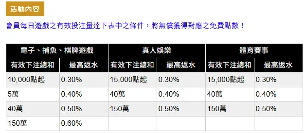 但如果想要更高額的返水,反而是看你的有效下注量,只要你下注的夠高,最高可以拿到0.6%的返水!
